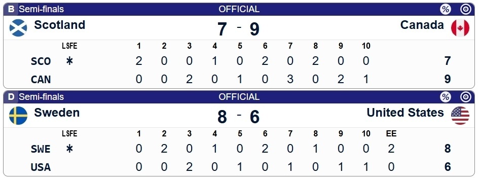 之后的半决赛里,加拿大队在第二局后手选择空局,要比苏格兰少一个标准偶数后手局的情况下,硬是靠着第七局的3分反超,并在第十局偷分,以9-7拿下对手。