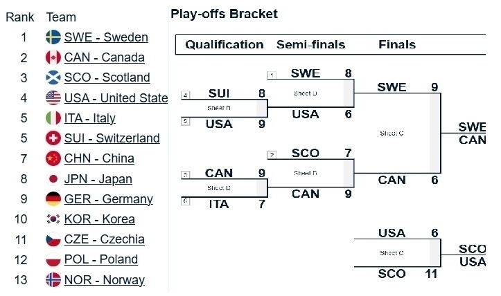 循环赛与首次参加世锦赛的敦士登队,都是10胜2负排在第三,最终靠着DSC成绩,埃丁队排在第一位,敦士登则经过席位赛的比拼后,半决赛再拿下苏格兰队,才再度与埃丁交手—循环赛加拿大队7-5胜出!