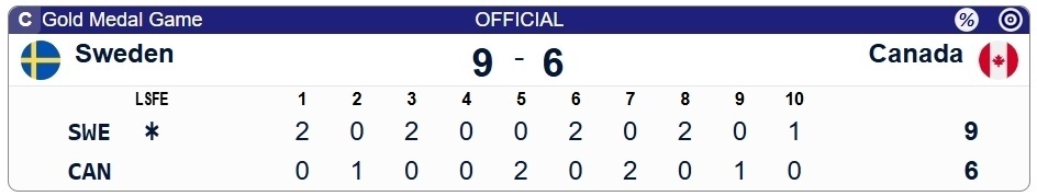 第九局再度被瑞典控分后,加拿大大势已去;而敦士登在第十局最后一投的溜壶,更是让埃丁在最后一投没出色的情况下,瑞典就已经拿到1分...比赛提前结束!