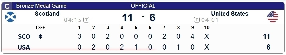 铜牌比拼里,苏格兰-怀特队以11-6战胜了18年平昌冬奥会金牌得主、舒斯特率领的美国队。