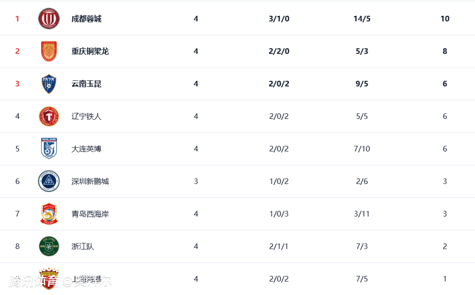 前4轮之后,成都蓉城以10分排名榜首,重庆铜梁龙以8分排名第2位,云南玉昆、辽宁铁人、大连英博分别以6分排名其后。