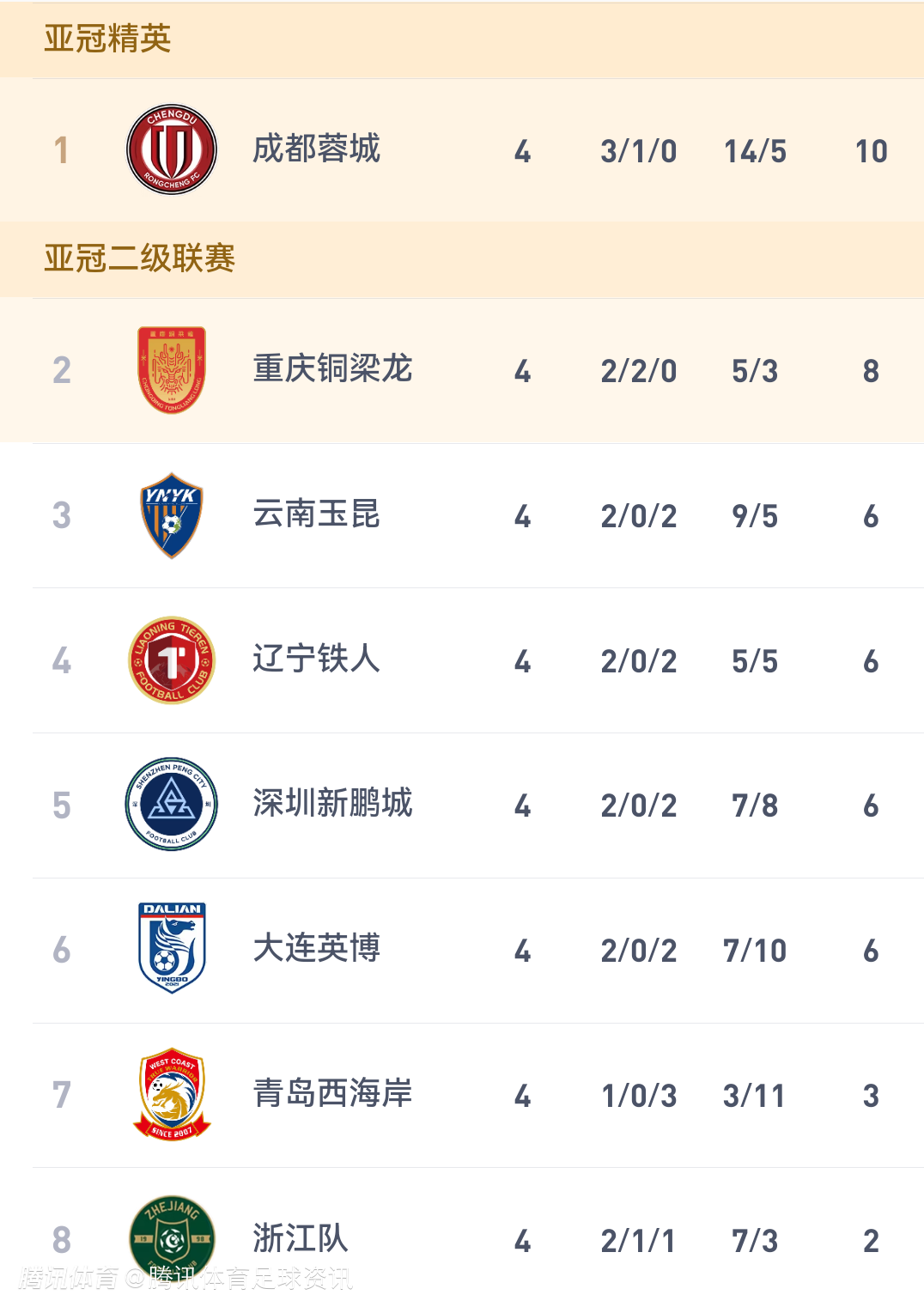 在本轮榜首的蓉城5-1大胜西海岸,目前是3胜1平积10分继续领跑积分榜,随后是升班马铜梁龙,他们在本轮1-0小胜浙江继续保持不败排名第二,他们目前是2胜2平积8分。之后第三则是另一支西南球队云南玉昆,虽然本轮1-2不敌海港,但还是凭借着2胜2负积6分排在第三名。
